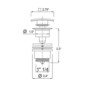 Complete the sink of your vanity with this square pop-up drain without overflow system from the Vanity Complements family. It is constructed of solid brass for a lifetime use without problems. Designed to work with glass, stone, ceramic or any sink with a 2.25 inch drain opening, this emergent drain fits most copper bath sinks and drainage openings over 2.25 inches. The drain assembly includes two rubber seals for easy installation and tail pipe 1/4 inch. The drain is 4 inches high (when closed). Simply add water and enjoy the limited lifetime warranty.