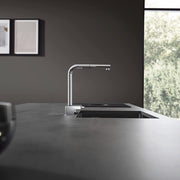 The Aquno Select kitchen faucet features a linear look with its L-shaped spout. The angled spout highlights the precise angles of the overall design, so it can be perfectly matched with your cabinets and other interior design elements. The Aquno Select's spout features a pull-out function with laminar spray. It is easy to switch to the flat SatinFlow spray with the simple touch of the Select button on the faucet's base.