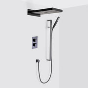 Pressure balanced 3-Way shower system of our family Devon. With this shower set you have everything you need to install your shower. It is a three-way system with outlet for double function shower head with rain and waterfall and outlet for sliding bar with hand shower. Composed of three-way thermostatic mixer, hand shower, hose, hose connector, sliding bar and shower head with rain and waterfall function.