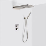 Pressure balanced 3-Way shower system of our family Devon. With this shower set you have everything you need to install your shower. It is a three-way system with outlet for double function shower head with rain and waterfall and outlet for hand shower. Composed of three-way thermostatic mixer, hand shower, hose, hand shower shower connector with holder and shower head with rain and waterfall function.