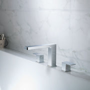 Three Hole Deck Mount Bathtub faucets have a separate hot and cold handle and are installed on the deck next to the edge of the bathtub with 3 drilled holes that are each about 4 inches apart. The faucet body and handles are all separate pieces with volume control valves concealed under the tub.