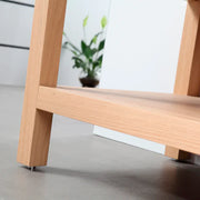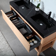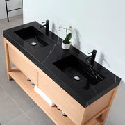 Natural artistry characterizes the Bibury 60-inch in Whitewash Oak freestanding bathroom vanity. Featuring original wood pattern and Black Marquina Quartz countertop with two sinks, this freestanding piece also boasts two wide, handle-less drawers with large open shelving. This well-designed series stands out from all bathroom furniture and gives users a true luxury experience.