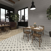 Tradition and avant-garde come together to create Mintons, a new porcelain tiles series inspired by the hydraulic mosaics of the 19th century, a century marked by the Victorian Era. The range presents 9 tiles with a hydraulic mosaic design, 3 in neutral colors (Canterbury, Buckingham and Old White, which is the plain white colour used to match the coloured designs), 3 in pastel colours (Harriet, Catalina and Victorian) and 3 in Victorian colours (Lancelot, Balmoral and Bellamira). The geometric patterns of these tiles make it possible to create floor and wall coverings, in which the ceramic takes centre stage.