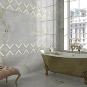 A subtle marble effect tile with a brushed finish, 60x60 cm in size, its soft grayish blue color streaked with veins will fill any room with brightness and sophistication.SELENE, the new ceramic range in which the natural onyx graphic is treated delicately in an array of colors that range from an ivory hue and grayish blue to deep gray. The SELENE range can fill public spaces and homes with luxury and sophistication.A modern yet timeless range, with a wide variety of accessories, to create spaces that are full of character and class.