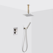 Pressure balanced 2-3 Way shower system of our family Devon. With this shower set you have everything you need to install your shower. It is a two-way system with outlet for shower head and outlet for hand shower. This system is available in different finishes. Composed of two-way pressure balanced mixer, connector with holder for hand shower, hand shower, hose, shower arm for ceiling installation and shower head of slim design.