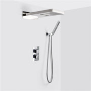 Pressure balanced 3-Way shower system of our family Devon. With this shower set you have everything you need to install your shower. It is a three-way system with outlet for double function shower head with rain and waterfall and outlet for hand shower. Composed of three-way thermostatic mixer, hand shower, hose, hand shower shower connector with holder and shower head with rain and waterfall function.