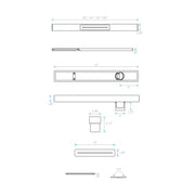 • Outlet: Drain base has an offset 2” outlet. This feature allows you to rotate the base to accommodate a left or right position and the sliders adjust to connect the grate in a different position than the outlet.