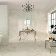 A subtle marble-effect tile with a gloss finish, 30x90 cm in size, its soft ivory color streaked with veins will fill any room with brightness and sophistication.SELENE, the new ceramic range in which the natural onyx graphic is treated delicately in an array of colors that range from an ivory hue and grayish blue to deep gray. The SELENE range can fill public spaces and homes with luxury and sophistication.A modern yet timeless range, with a wide variety of accessories, to create spaces that are full of character and class.