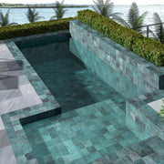 Porcelain tile in turquoise tones, with 14,7x14,7 cm format, thought by pools. Its Class 3 non-slip finish produces an optimum level of security. Thanks to this reinterpretation of the famous Bali stone and the tiles' colour, we can coat pools and transform them into small tropical paradises.The natural beauty of the Tahiti island and its inspirational culture are joined with the white sand light and the turquoise waters of its beaches to create a new collection of tiles that invites you to immerse yourself in the ocean depths. Tahiti suggests a pool tiles series inspired by the beautiful landscapes of this Pacific island and with an aspect that remembers us of the Balinese stone, a complete trend in the pool’s design.