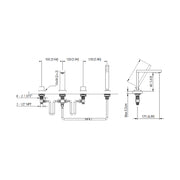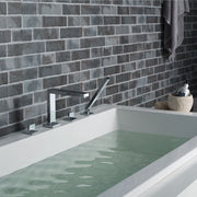 Four Hole Deck Mount Bathtub faucets have a separate hot and cold handle with a hand shower and hose. They are installed on the deck next to the edge of the bathtub with 4 drilled holes that are each about 4 inches apart each. The faucet body and handles are all separate pieces with volume control valves concealed under the tub.