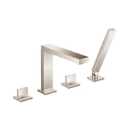 Four Hole Deck Mount Bathtub faucets have a separate hot and cold handle with a hand shower and hose. They are installed on the deck next to the edge of the bathtub with 4 drilled holes that are each about 4 inches apart each. The faucet body and handles are all separate pieces with volume control valves concealed under the tub.
