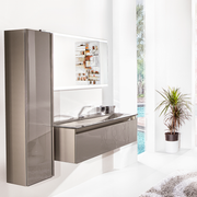Water and humidity have always created major problems on bathroom furnitures. The problem of swelling caused by water and humidity no longer happens with Acqua collection. Aluminum material forms the body of bathroom cabinets. Compact laminates , glass and leather are used on the surfaces of the bathroom cabinets.Inspired by nature ,bathroom cabinets are designed with special materials resistant to water, humidity and even scratches.