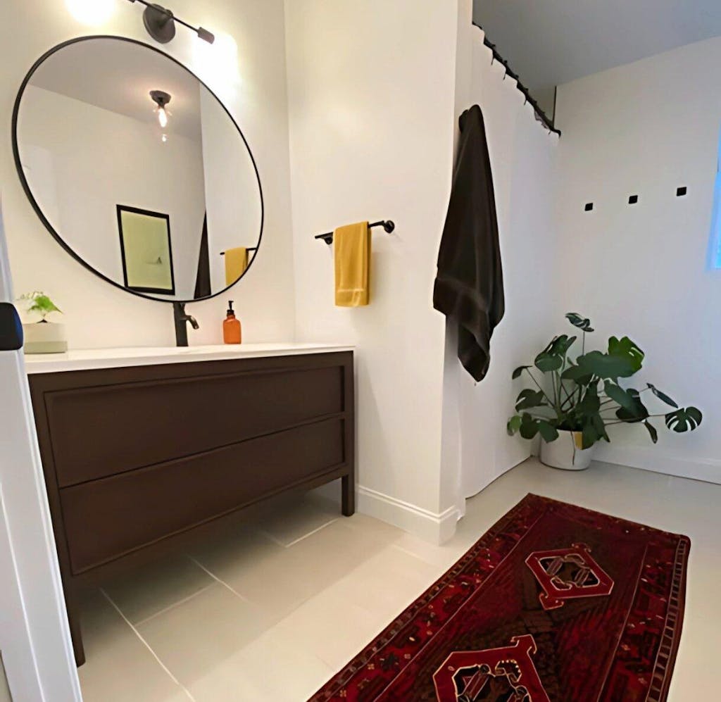 This is an Annecy series 48-inch vanity in Charcoal Oak, a freestanding bathroom vanity. The simplicity of the design brings freshness to the bathroom. The sink/countertop is glossy pure white. Each balanced, equal line gives this vanity a sense of peaceful relaxation.