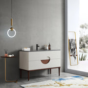The Burano 48-inch freestanding vanity in Beige is one of the best selling lines. The fashionable center is designed perfectly and uniquely hides the drawer opener. Two spacious drawers easily store all your vanity essentials. The piece combines modern artistic design with classic coloring. Burano's designer used elegant, beautiful lines as the inspiration, and also a fusion of shapes, giving the user a sense of freshness and renewal.