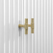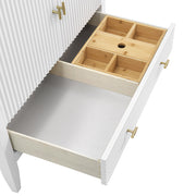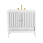 The 36" Myrrin Single Vanity features a minimalistic silhouette with fluted details, resulting in a blend of classical elegance and contemporary design. The deeply fluted panels run perpendicular on the doors and drawers, adding sophistication and visual interest to the design. Toggle-style knobs in Champagne Brass provide a luxe accent to the rich Bright White finish. The two-door cabinet opens to a spacious interior with a single shelf and a convenient USB/Electric power outlet. A single, lower-level drawer lends additional storage. With the addition of a classic White Zeus Silestone top and undermount sink, this vanity is a seamless integration of modern design and functionality.