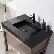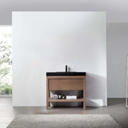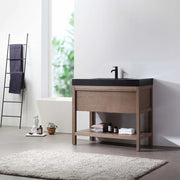 Natural artistry characterizes the Bibury 36-inch in Chestnut Oak freestanding bathroom vanity. Featuring original wood pattern and Black Marquina Quartz countertop with one sink, this freestanding piece also boasts one wide, handle-less drawer with large open shelving. This well-designed series stands out from all bathroom furniture and gives users a true luxury experience.