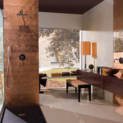 Impressive glass laminated in copper leaf that will give any setting a touch of elegance and sobriety. Ideal for combining with white and marble. There is also a matching glass washbasin.