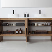 Celle combines elegant curves and straight lines to create a contemporary and classic piece of furniture. The doors open to reveal a generously sized two-shelf cabinet, with plenty of storage space. The cool white circular sink artistically mirrors the detailing on the front doors, while a pristine white countertop completes the piece.