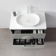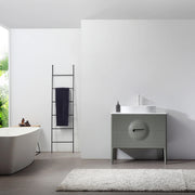 Modern artistry characterizes the 36-inch Colmar bathroom vanity. Featuring Olive Green finishing, this freestanding piece boasts two handle-less drawers with a large amount of storage space. An oval pop-out in the center perfectly and uniquely hides the drawer opener as part of the vanity's complete, fashionable design. Colmar is finished with a clean, white countertop and an elegant top-mounted sink. This well-crafted product gives the user's bathroom an upgraded sense of style.