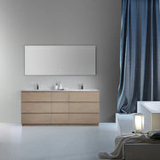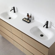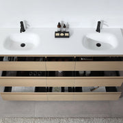 Natural artistry characterizes the 72 inch Golden Oak finished Rothenburg bathroom vanity. Featuring original wood pattern and matte finish, this freestanding vanity boasts multiple handle-less drawers with a large amount of storage space. Two sinks balance out an elegant white countertop. The vanity exudes simplicity but a sense of naturalness is maintained by the wood. It goes easily with other bathroom furniture.